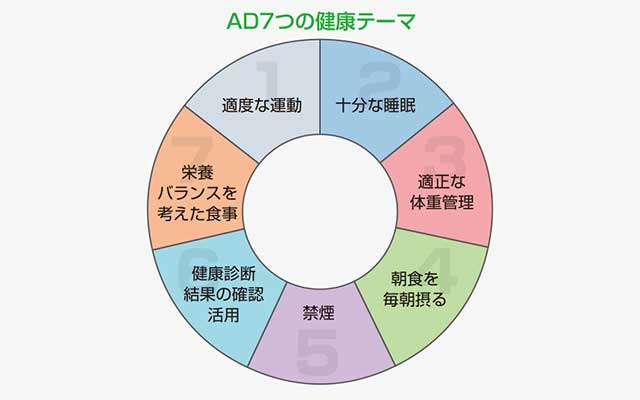 本年度は日常生活で意識すべき行動を「AD7つの健康テーマ」として示した。提示したのは▷適度な運動▷十分な睡眠▷適正な体重管理▷朝食習慣▷禁煙▷健康診断結果の活用▷栄養バランスの取れた食事―の七つだ。同グループ長の森田聡美さんは「ひとたび健康を損なうと、元のパフォーマンスを取り戻すには相応の時間を要してしまうため、病気や心の不調を防ぐ『未然防止』に注力しています。日頃から健康的な生活習慣を身につける意識を大切にしてもらいたいです」と話す。