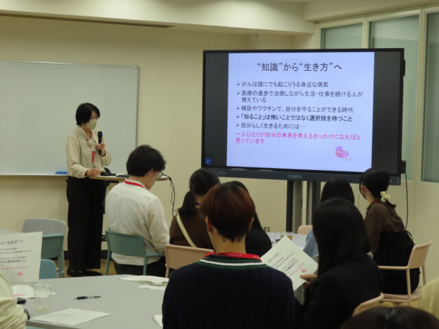 前半は、乳がん看護認定看護師からがんやその予防方法に関して講演いただいた後、がん経験者2名の方からがんへの向き合い方やがん検診の重要さについてお話しいただきました。