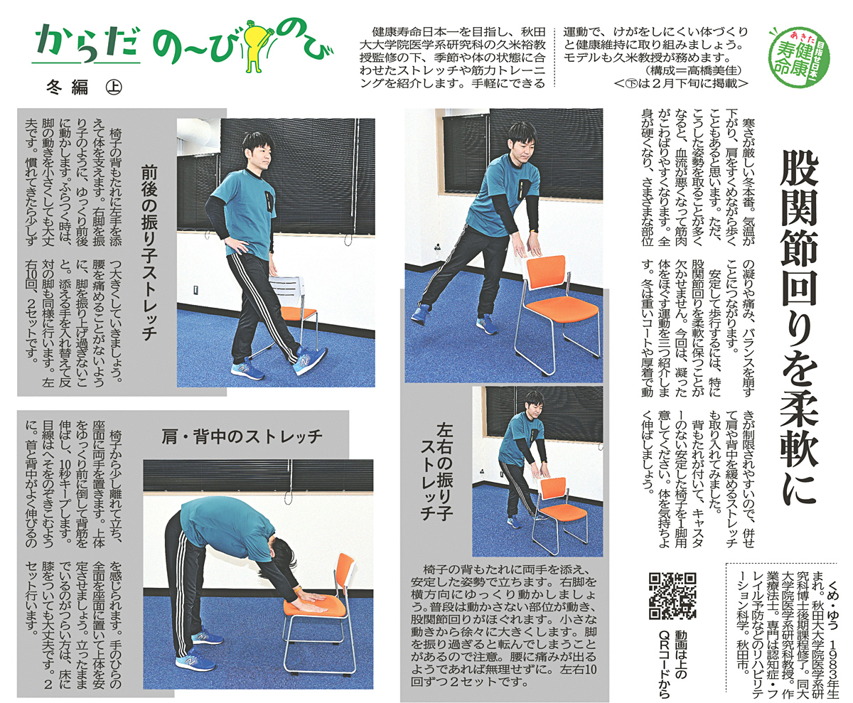 「からだの~びのび」冬編(上)が掲載されました 2026年01月23日 掲載 Facebook X(旧Twitter) LINE 1月23日付の秋田魁新報14面に「からだの~びのび」冬編(上)が掲載されました。 寒さが厳しい冬本番。血流が悪くなって筋肉がこわばりやすくなります。今回は、凝った体をほぐす運動を3つ紹介します。 ※クリックして拡大 「からだの~びのび」冬編(上)を動画を見ながらやってみる ▶「からだの~びのび」冬編(上)|秋田魁新報電子版