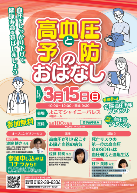 高血圧予防や発症した場合の診断・治療など、様々なお話を聞くことができる機会ですので、是非ご参加ください。